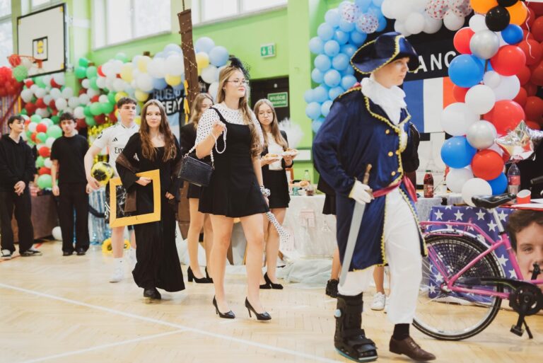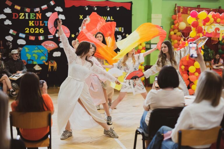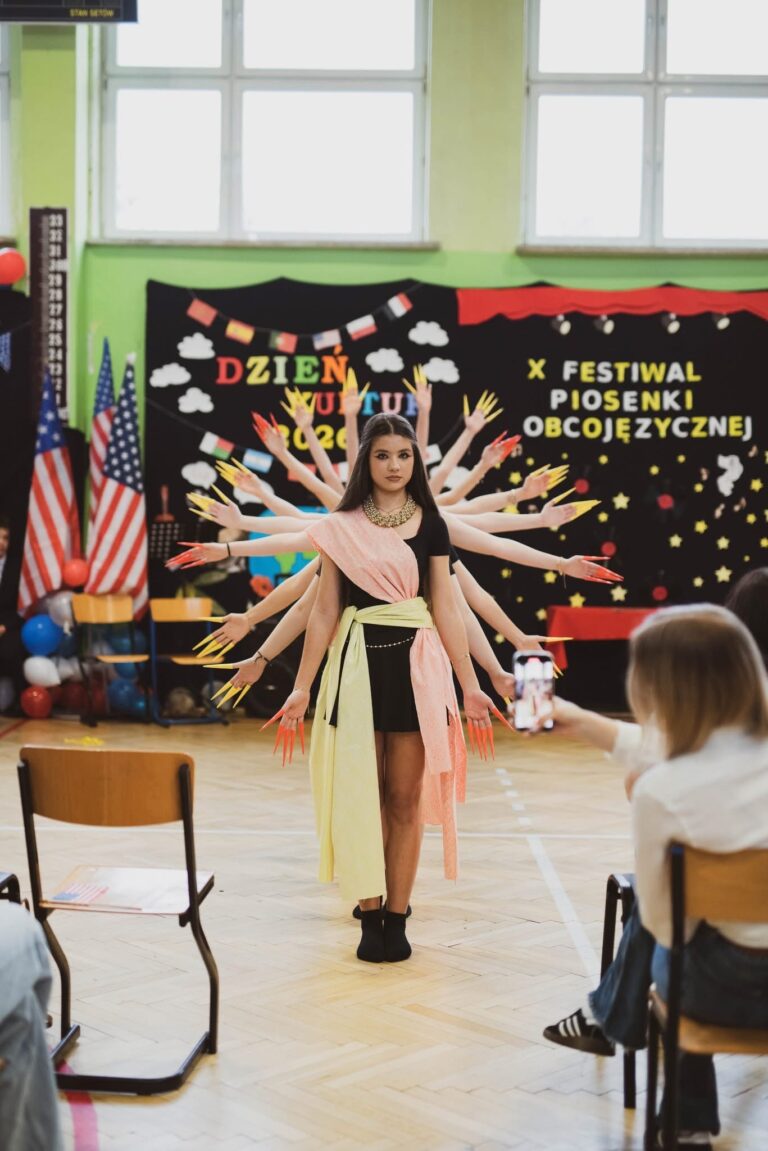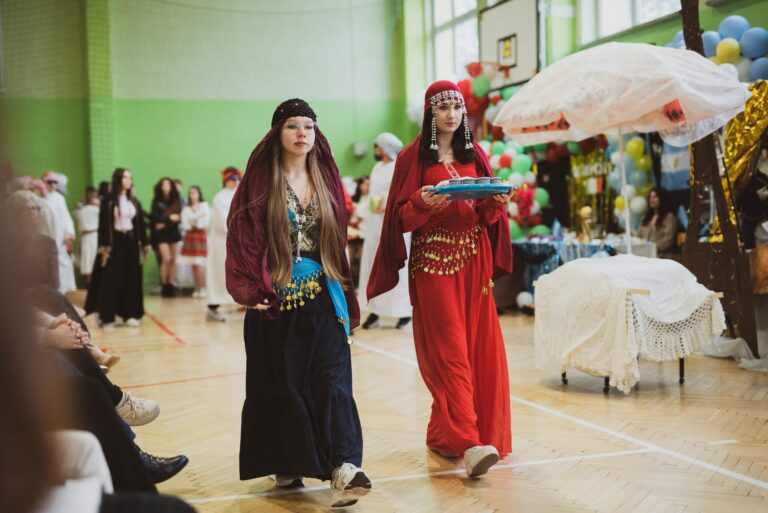 Po krótkiej przerwie rozpoczął się Dzień Kultur, czyli prezentacja różnych państw z uwzględnieniem ciekawostek, smaków, strojów, tańców i krótkich scenek. Niesamowity klimat, wspaniała rywalizacja , ogromna różnorodność i pomysłowość młodzieży sprawiły, że wszyscy z przyjemnością oglądali występy poszczególnych klas. Na hali pojawiło się 12 stoisk, przybliżających 12 kultur, m.in. Francji, USA, Madagaskaru, Tajlandii, czy Japonii, na których można było zobaczyć charakterystyczne przedmioty i plakaty, a podczas występów podziwiać przepiękne stroje i tańce. Młodzież zadbała jednak nie tylko o ucztę dla ducha, ale też dla ciała – każda klasa częstowała smakołykami typowymi dla swojego państwa. Były m.in. croissanty, herbata miętowa, batatas a murro, bolo de arroz, pierogi, matcha, churrosy, tradycyjny polski wiejski stół i wiele innych smakołyków.