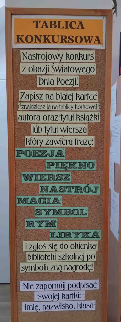 Konkurs w bibliotece z okazji Światowego Dnia Poezji –  Biblioteka zaprasza wszystkich chętnych uczniów.