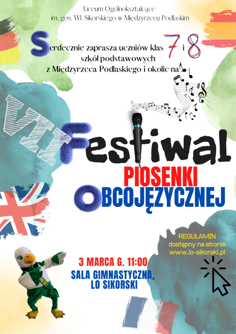 VII Edycja “Festiwalu Piosenki Obcojęzycznej” odbędzie się 3 marca 2023 r. (środa) o godzinie 11.00. Na zgłoszenia czekamy do 22 lutego 2023 r.Wykonawcy prezentują w danej kategorii tylko jedną piosenkę (utwór nie może przekraczać 5 minut!). Szkoły mogą zgłosić do eliminacji maksymalnie 3 piosenki w wybranych językach poprzez nadesłanie na adres organizatorów ankiety zgłoszeniowej wraz z klauzulą dotyczącą danych osobowych, podpisaną przez rodzica lub opiekuna prawnego osoby nieletniej. Podkładem muzycznym podczas przesłuchań konkursowych może być akompaniament bądź nagranie instrumentalne. Karty zgłoszeń i nagrane podkłady do piosenek należy przesłać na adres mailowy sikorski.festiwal@gmail.com.Zastrzega się brak zmiany utworu na trzy dni przed Festiwalem.